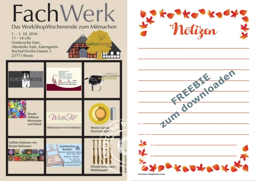 Ich hatte aber die Gelegenheit, bei „Wiebke Kiss Wohndesign“ verschiedene Techniken beim Malen mit Kreidefarbe auszuprobieren und ich habe mir ein Klemmbrett gebastelt unter der Anleitung von Brigitte Bodendorff vom Buch Atelier Plön. Zu letzterem habe ich dann noch am gleichen Abend herbstliche Notizzettel entworfen, die Ihr euch weiter unten als Freebie downloaden könnt.