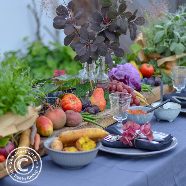 Ich habe zu dem Thema eine spätsommerliche Tischdeko kreiert, mit frischen Kräutern, Obst und Gemüse. Der Tisch ist gedeckt, das Essen vorbereitet und es fehlen nur noch die Gäste, die sich daran setzen und einen schönen Abend mit uns zusammen verbringen.