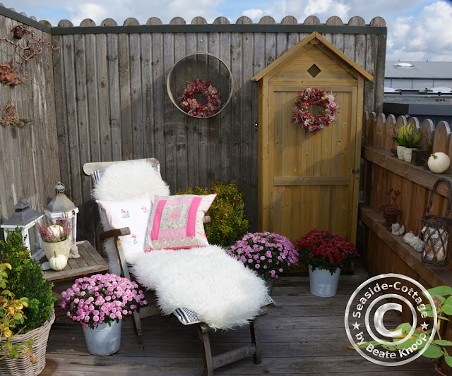 Darf ich Dich einladen auf ein paar herbstliche Sonnenstrahlen auf unserer Dachterrasse? Im hintersten Teil haben wir am längsten Sonne. Also steht hier natürlich die Sonnenliege. Im Hochsommer, wenn denn mal die Sonne scheint, hält man es hier allerdings nicht lange aus. Jetzt im September, der uns in diesem Jahr mit viel Sonne für den entgangenen Sommer entschädigt, kann man ganz entspannt die Sonnenstrahlen genießen. Und was liegt bei einer Dekorateurin und Floristin näher, als dieses tolle Chillout-Plätzchen auch entsprechend der Jahreszeit zu dekorieren ;) Nimm Platz und schau’s Dir mal genauer an…