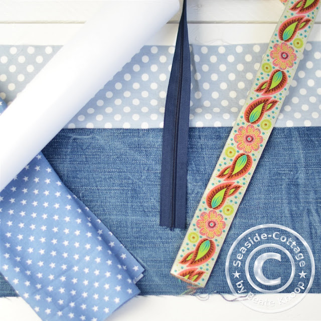 - Als Oberstoff einen Streifen alte, gewaschene Jeans in den Maßen 44 x 19 cm sowie einen Streifen Baumwollstoff in den Maßen 44 x 11 cm