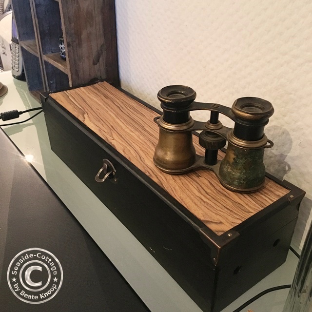- Der schwarze Holzkasten über meinem „Nicht“-Apfel-Laptop ;) war mal eine Geschenkbox für eine Weinflasche. Unter dem Holzfurnier-Stoff verbirgt sich ein nicht so schönes, verblasstes Weinmotiv. Jetzt sieht der Holzkasten wieder richtig edel aus und beherbergt Stifte, Klammern, Post it’s, Ladekabel…