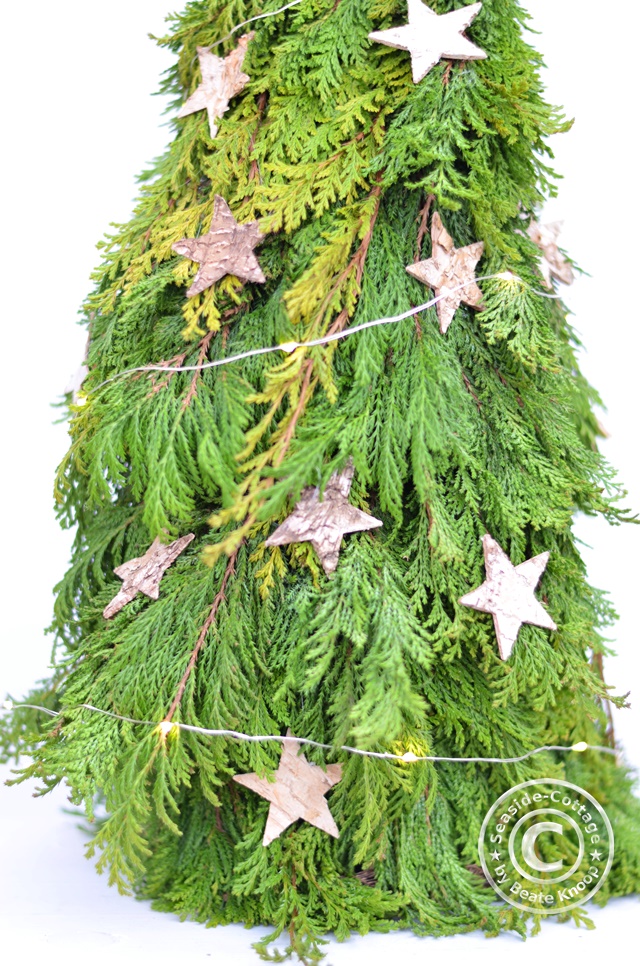 Wenn ihr eine Zypresse im Garten habt, dann schneidet doch schnell noch ein paar Zweige ab und wickelt euch ein Bäumchen daraus. Und schwupps…habt ihr wieder eine individuelle Weihnachtsdeko.