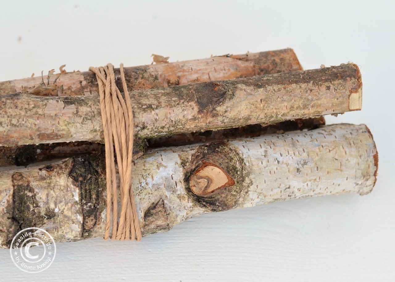 - Legt euch die drei Äste so zurecht, das sie später auf dem Tisch gut und stabil liegen und wickelt jeweils um die Enden ein paar Runden Paketband und schnürt es auf der Unterseite fest zusammen.
