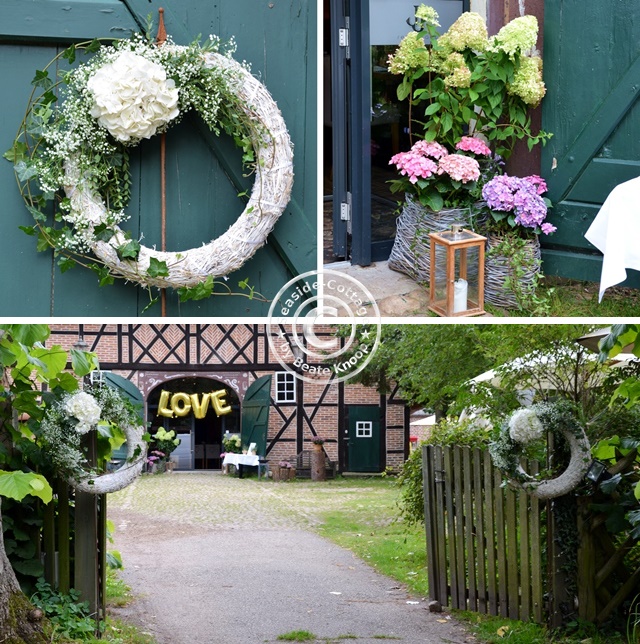 Das Forsthaus Waldhusen liegt (wer hätte das gedacht ;)) in einem Wald vor Lübeck und hat einen wunderschönen Garten. Den Eingang dorthin habe ich mit zwei schlichten weißen Strohkränzen mit Hortensien, Schleierkraut und Efeu dekoriert.