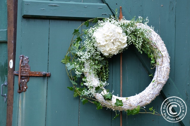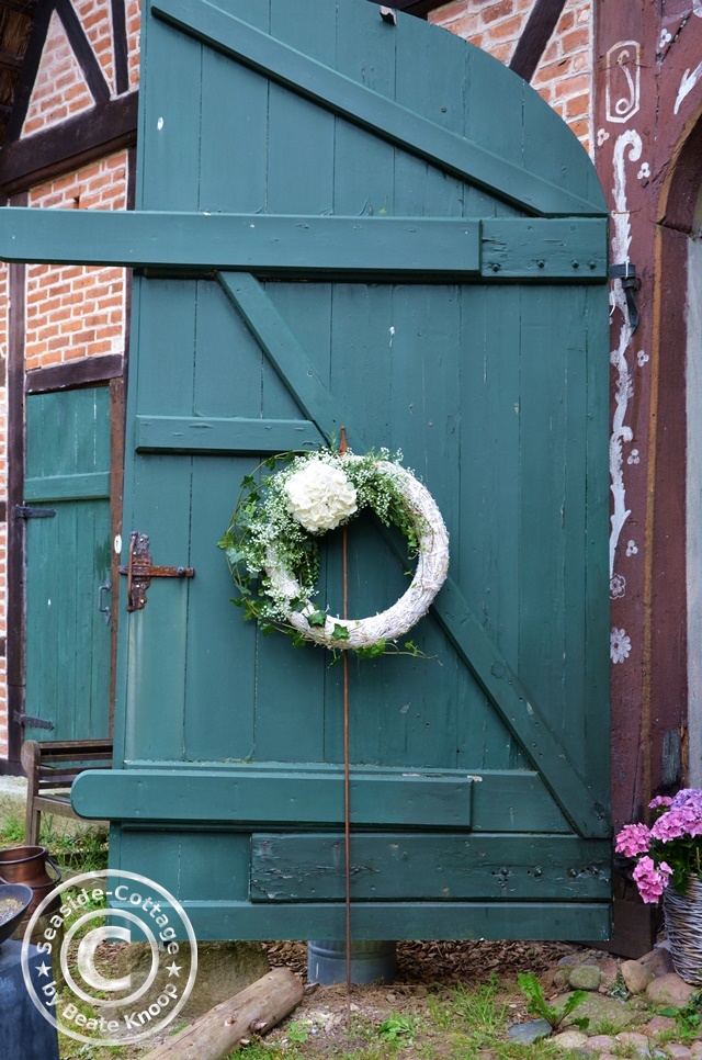 Das Forsthaus Waldhusen liegt (wer hätte das gedacht ;)) in einem Wald vor Lübeck und hat einen wunderschönen Garten. Den Eingang dorthin habe ich mit zwei schlichten weißen Strohkränzen mit Hortensien, Schleierkraut und Efeu dekoriert.