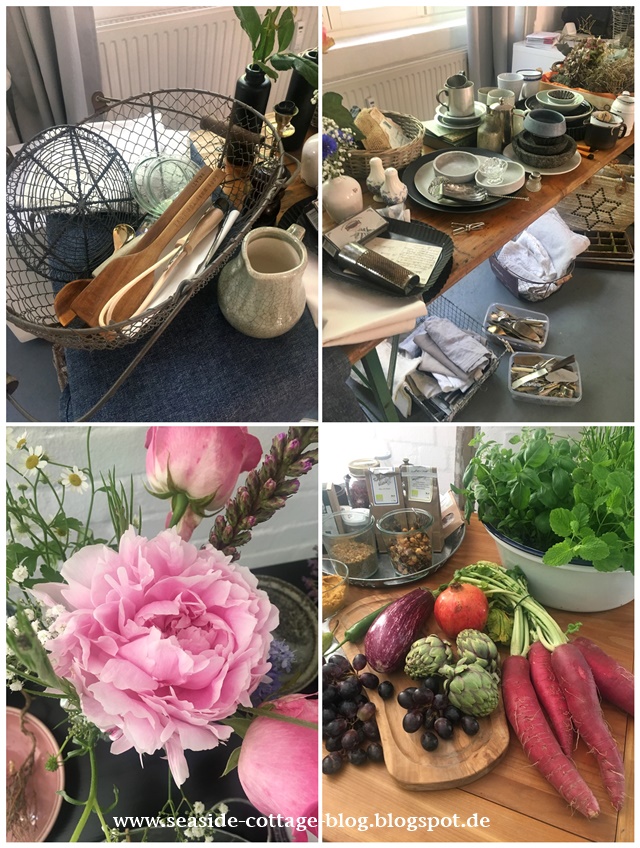 Drinnen waren Tische aufgebaut mit den „Props“, also den Requisiten, die wir später zum fotografieren verwenden durften. Jede Menge schöne Dinge wie Vasen, Teller, Schalen, Besteck, Leinentücher, getrocknete Blumen, alte Bücher, Holzbretter und -schubladen und ganz viele weitere Vintagedinge, die mein Herz gleich höher schlagen ließen.