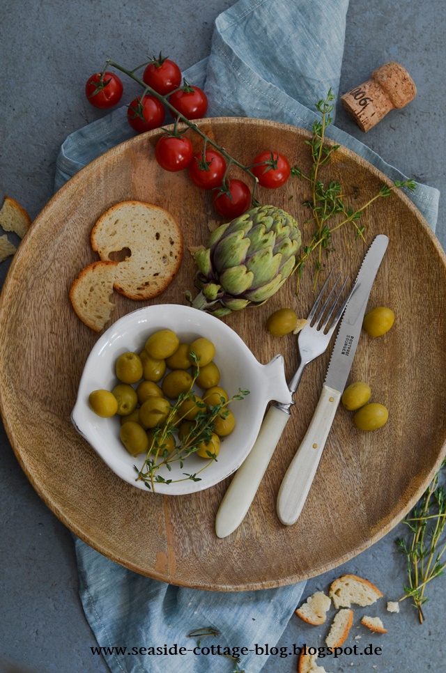 Danach war es dann unsere Aufgabe, unser eigenes Set zu gestalten und zu fotografieren. Props hatten wir ja zur Genüge zur Verfügung. Ich versuchte mich erst einmal an einem Holzteller mit Serviette, Oliven, Artischocken und Tomaten. Der Untergrund war in diesem Fall der wunderschöne Betonfussboden. Mit den Krümeln, die das Bild beleben sollen, tue ich mich noch etwas schwer ;)
