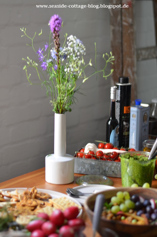 Neben all den schönen Vintagedingen gab es auch noch wunderschöne frische Blumen wie Rosen, Päonien, Mutterkraut und Wiesenblumen und einen Tisch voll beladen mit köstlichem Obst und Gemüse, Oliven und Brot, leckere selbstgemachte Aufstriche und Dips…ich sag’s euch, da konnte man so richtig schwelgen. In der Mitte des Raumes waren die Stühle für die (ausschließlich weiblichen) Teilnehmerinnen aufgestellt und hinter uns war der Thresen mit kühlen Getränken, Kaffee & Tee, von denen jede nehmen durfte, wie sie wollte.