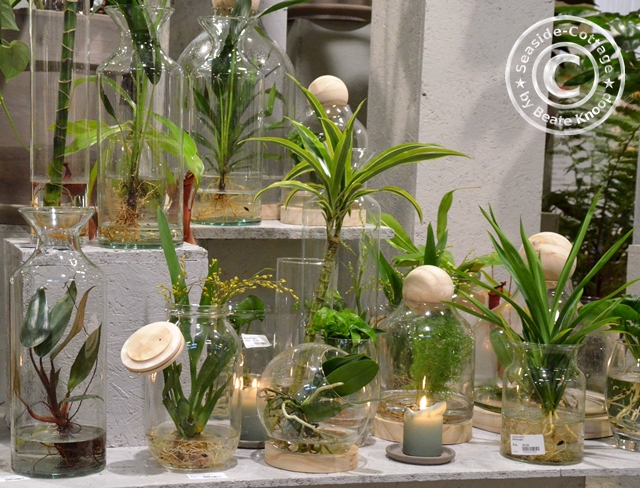 Hier gefällt mir die Präsentation der Grünpflanzen sehr gut: in Glasvasen, ohne Erde und die Wurzeln somit sichtbar im Wasser. Ob das aber auf Dauer gut für die Pflanzen ist? Ist jedenfalls nicht „artgerecht“ ;D Aber schön!