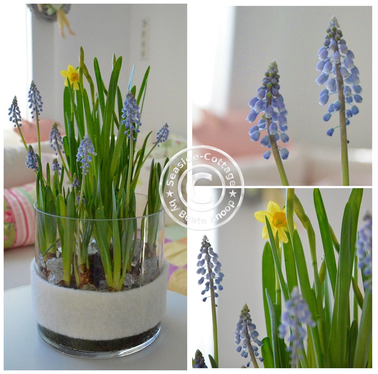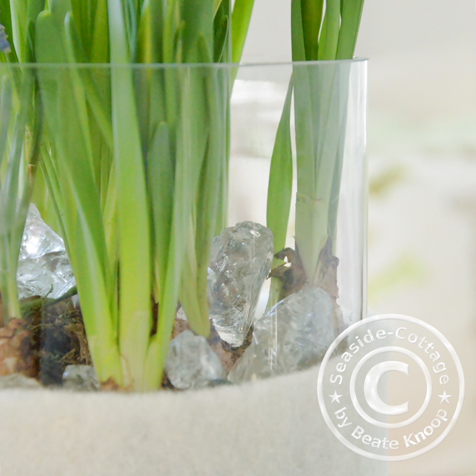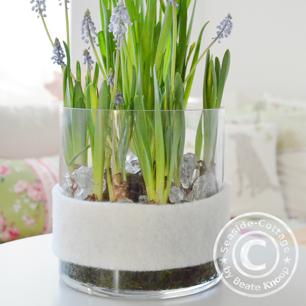 Tête-à-Tête, Perlhyazinthen und weiße Narzissen (die aber hier noch nicht blühen), etwas Moos, ein paar Glasbrocken und ein Stück weißer Filz. Mehr braucht es nicht für diese Deko. Den winterlichen Touch erhält man durch das Filzband ums Glas und die Glasbrocken darin.