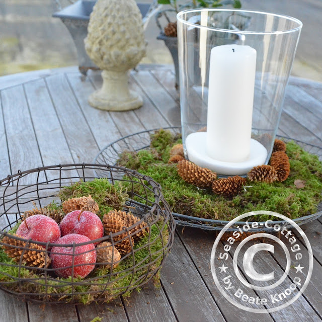 Winterliche Terrassendeko mit Drahtkörben