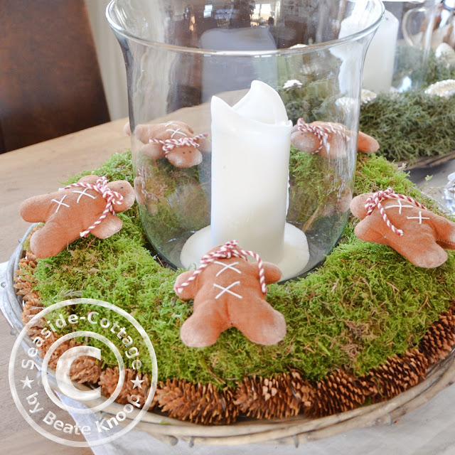 Jetzt kommen wir zu meinem „Adventskranzersatz“: Ursprünglich wollte ich den mit Moos bewickelten Kranz zu einem Adventskranz machen, aber dann gefiel er mir so pur am Besten. Die Zapfen darunter habe ich beim Gassigehen mit Paula gefunden und hab sie mit festem Draht in den Kranz gesteckt. Die Gingerbreadmen liegen einfach nur obenauf. Ich hatte sie schon vor vielen Jahren mal genäht nach einer Vorlage von Tone Finnanger (Tilda).