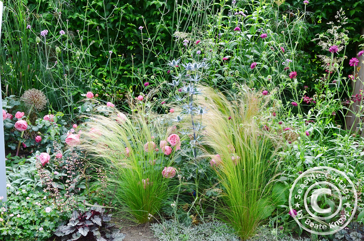 Diese Pflanzkombination hat es mir angetan: gefüllte rosa Rosen mit Purpurglöckchen, Storchschnabel, Feenhaargras, Sterndolde und blauer Diestel.