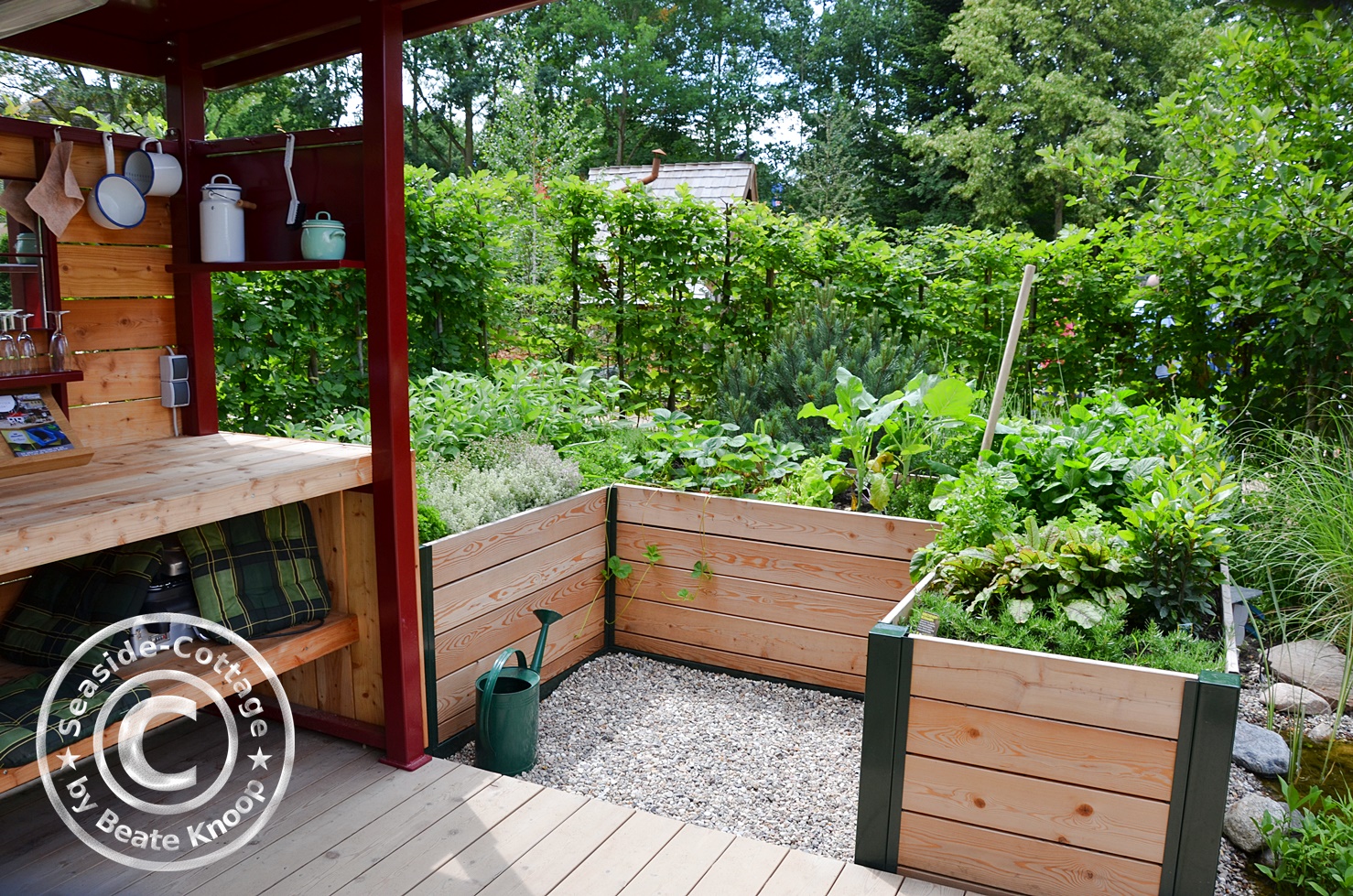 Der Hochbeet-Küchengarten direkt neben der Outdoorküche
