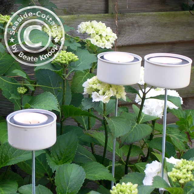 Zu guter letzt könnt ihr nun eure neuen Garten-Teelichthalter ins Beet oder den Blumentopf stecken, etwas Vogelsand einfüllen und das Teelicht hineinstellen.